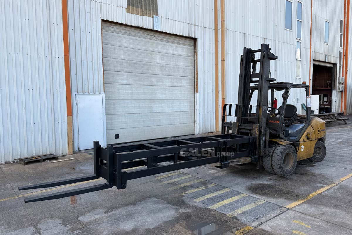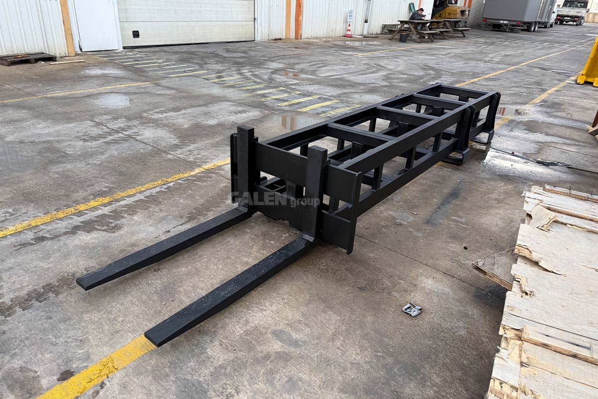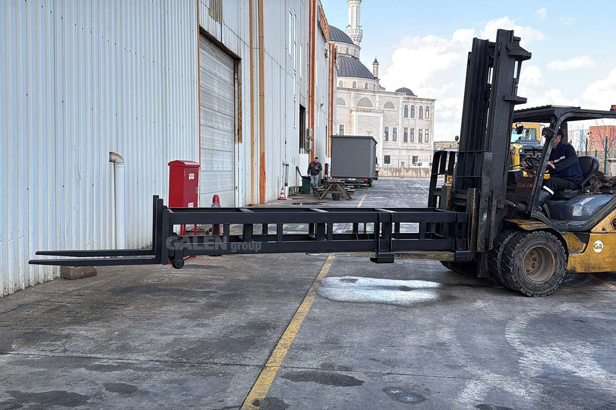 A steel attachment designed to extend the length of standard forks, allowing safe handling of loads at longer distances. It is easily installed by sliding onto the existing forks and locking securely in place, enhancing maneuverability and safety, especially in transportation and warehousing operations.