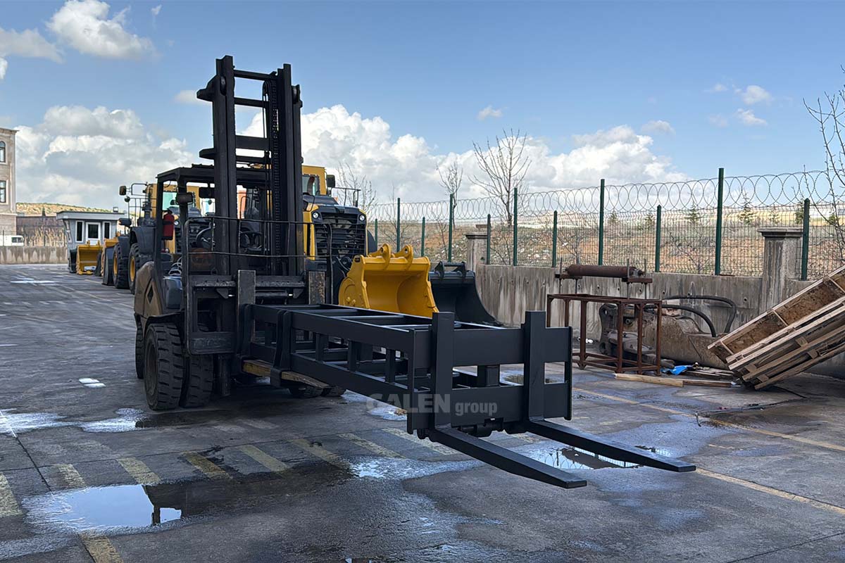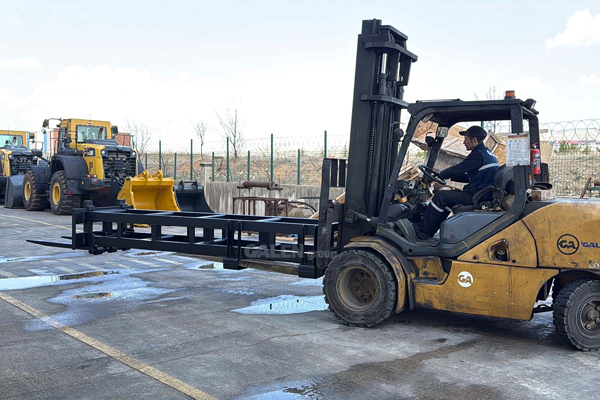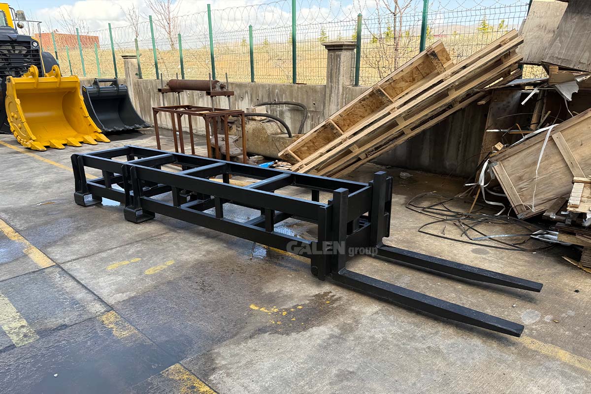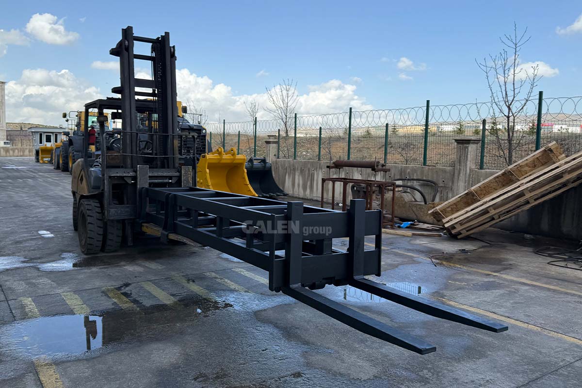 A steel attachment designed to extend the length of standard forks, allowing safe handling of loads at longer distances. It is easily installed by sliding onto the existing forks and locking securely in place, enhancing maneuverability and safety, especially in transportation and warehousing operations.